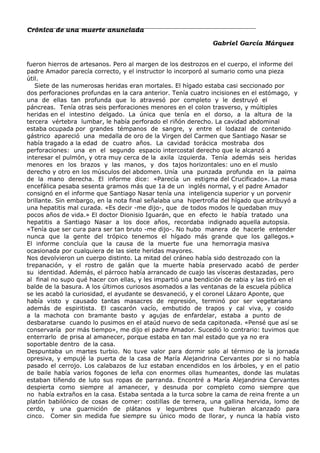 Crónica de una muerte anunciada. Anunciada se narra la historia del asesinato de Santiago Nasar por parte de los. No sólo es una muerte anunciada sino que además se trata de una crónica en el mejor estilo periodístico.
